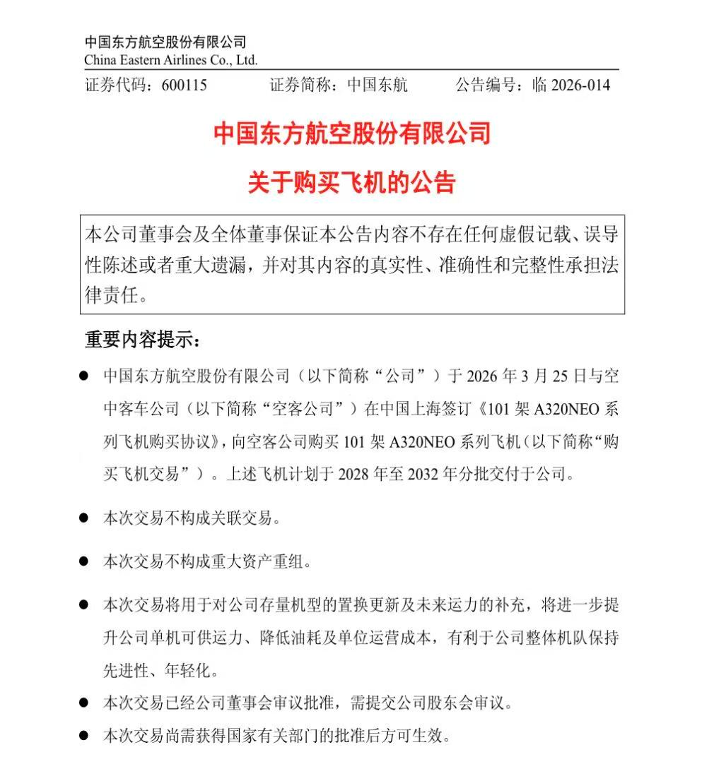 而3月25日,中国国航2026年第一次临时股东会上,也会审议引进60架A320NEO系列飞机的问题。此前中国国航公告过,于2025年12月30日与空中客车公司签订飞机购置协议,拟向空客公司购买60架空客A320NEO系列飞机,用于优化机队结构和补充长期运力,扩大国航机队的运载能力。这批新飞机同样会在2028年至2032年分批交付。